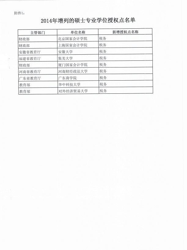 近日,全国税务专业学位研究生教育指导委员会秘书处收到国务院学位委员会下发的《关于下达2014年审核增列的硕士专业学位授权点及撤销的硕士学位授权点名单的通知》(学位[2014]14号)。国务院学位委员会批准增列了9个税务硕士专业学位授权点,分别是:北京国家会计学院、上海国家会计学院、安徽大学、集美大学、厦门国家会计学院、河南财经政法大学、广东商学院(2013年更名为“广东财经大学”)、华中科技大学、对外经济贸易大学。至此,全国税务硕士专业学位授权点由原来的36个增加至45个。