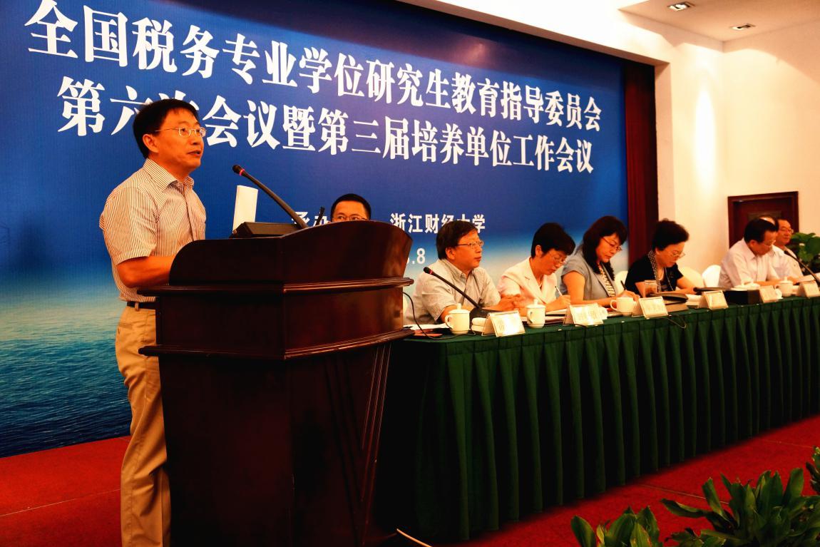 8月27日,第三届全国税务专业学位研究生教育培养单位工作会议顺利召开。全体教指委委员、外聘专家以及培养单位负责人和骨干教师出席了会议。国务院学位办副主任、教育部学位管理与研究生教育司副司长孙也刚,浙江省国家税务局局长周广仁,浙江省地方税务局副局长、巡视员单美娟,浙江财经大学校长王俊豪、副校长钟晓敏出席了开幕式。本次会议会期一天,参会人数共计92人左右。教指委副主任委员雷根强和马国强分别主持了上午和下午的会议。