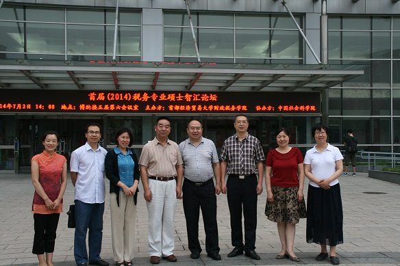 2014年7月2日,首届“税务专业硕士智汇论坛”于首都经济贸易大学成功举办。本次论坛由首都经济贸易大学财政税务学院发起并主办,中国社会科学院研究生院税务硕士教育中心协办。首都经济贸易大学财政税务学院、中国社会科学院研究生院税务硕士教育中心及中央财经大学税务系近40名税务专业硕士参与本次论坛。
