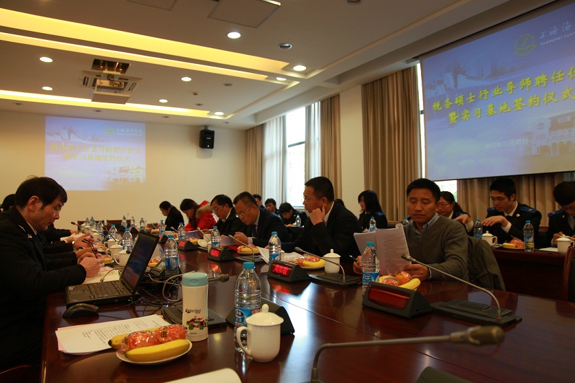 12月27日,上海海关学院税务硕士行业导师聘任仪式暨实习基地签约仪式在志远楼2102举行,仪式由副院长陈晖教授主持,受聘的校外行业导师、研究生导师组,研究生处有关人员及全体2013及税务硕士研究生参与仪式。