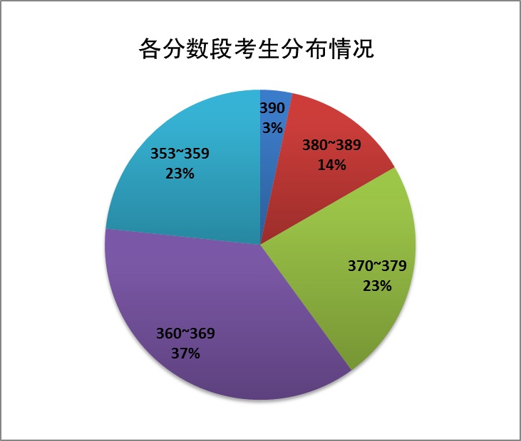 从拟录取考生的考分来看,首届税务硕士生源质量较高。今年教育部公布的经济类研究生进入复试的初试基本线为340分,我院拟录取的30名考生中,初试最高分390分,最低分353分。其中,380分以上考生共5人,占16.7%(其中1人390分);370分~379分考生共7人,占23.3%;360分~369分考生11人,占36.7%;353分~359分考生共7人,占23.3%(见图表)。