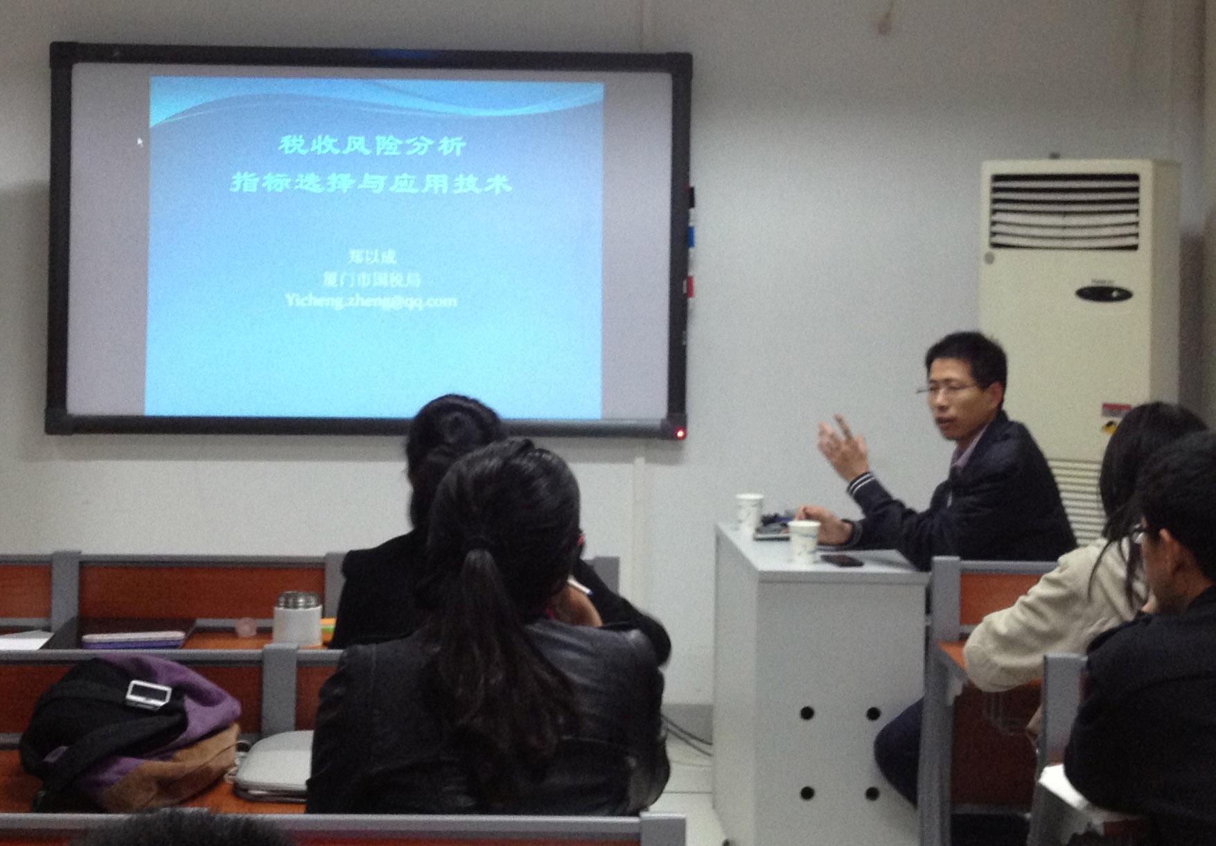 2013年3月26日,厦门市国家税务局征管和科技发展处处长郑以成应邀为税务专硕的学生们作了题为《税收风险分析——指标选择与应用技术》的讲座。