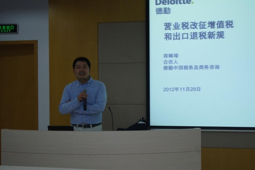 2012年12月7日晚18时许,由德勤中国税务及商务咨询合伙人蒋琳琦主讲的“营改增”实务模块课程如期举行。蒋先生以他丰富的经验和独到的视角主要从增值税试点改革的背景和法规、“营改增”实践中面临的难题以及如何积极筹备应对改革等方面展开了讨论;最后,蒋先生引导大家分析了几个实务案例,让大家对“营改增”有一个更加感性的认识。