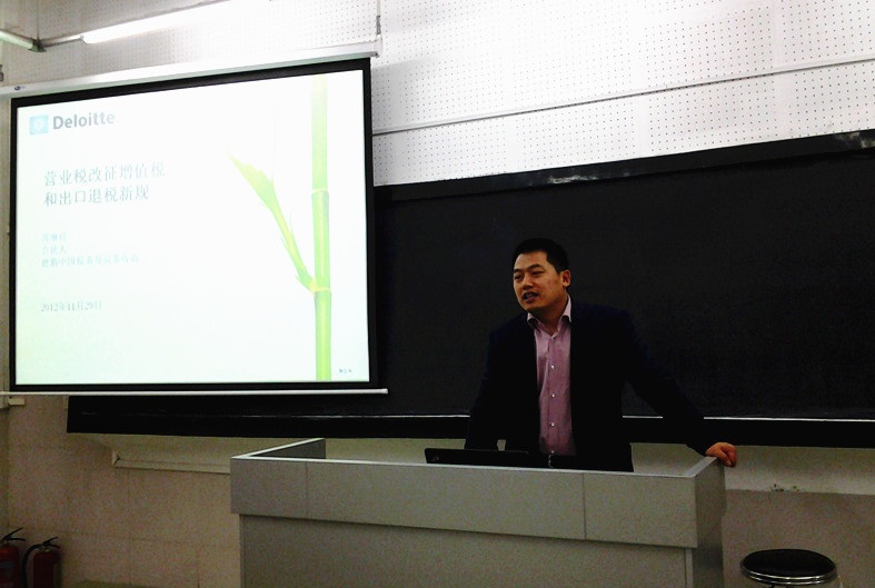 2012年11月29日,德勤税务师事务所合伙人蒋琳琦先生应邀给厦门大学税务专业学位研究生讲解了营业税改征增值税和出口退税新规。2012年12月27日,德勤税务师事务所合伙人蒋颖女士作了题为《企业并购的相关中国税务法规》的讲座。2013年元月3日,德勤税务师事务所另一位合伙人刘颀女士为厦门大学税务专业学位研究生作了本学期的最后一次讲座:《中国个人所得税专题介绍》。